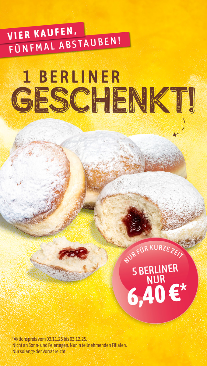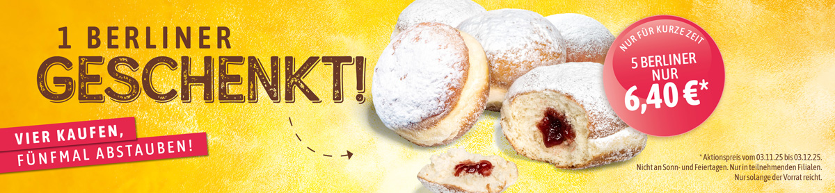Ohne Insekten Wir suchen Aktions-Kachel Aktion Berliner geschenkt Wochenangebot Kachel unten KW46 FREUNDSCHAFTSPREISE 12.11. – 19.11. * Aktionspreise nicht an Sonn- und Feiertagen. * Aktionspreise nicht an Sonn- und Feiertagen. Standorte normal nach Allerheiligen 2025 ALLE UNSERESTANDORTE MIT ÖFFNUNGSZEITENAUF EINEN BLICK